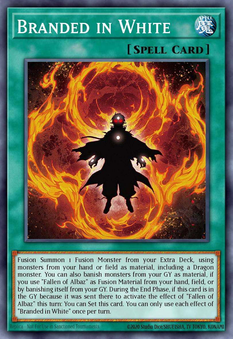 Fusion Summon 1 Fusion Monster from your Extra Deck, using monsters from your hand or field as material, including a Dragon monster. You can also banish monsters from your GY as material, if you use “Fallen of Albaz” as Fusion Material from your hand, field, or by banishing itself from your GY. During the End Phase, if this card is in the GY because it was sent there to activate the effect of “Fallen of Albaz” this turn: You can Set this card. You can only use each effect of “Branded in White” once per turn.