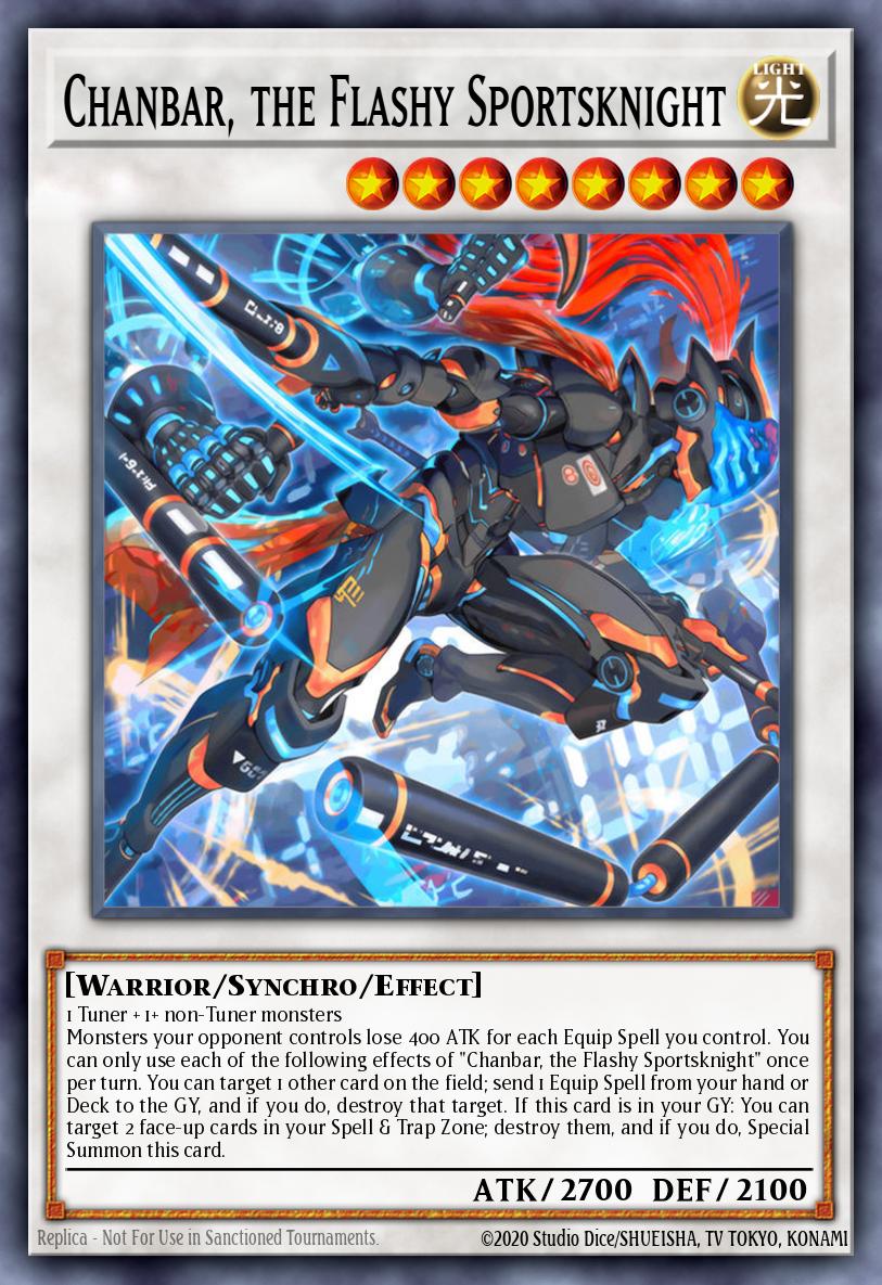 Monsters your opponent controls lose 400 ATK for each Equip Spell you control. You can only use each of the following effects of “Chanbar, the Flashy Sportsknight” once per turn. You can target 1 other card on the field; send 1 Equip Spell from your hand or Deck to the GY, and if you do, destroy that target. If this card is in your GY: You can target 2 face-up cards in your Spell & Trap Zone; destroy them, and if you do, Special Summon this card.