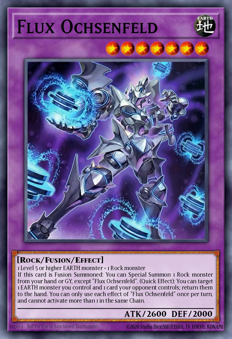 If this card is Fusion Summoned: You can Special Summon 1 Rock monster from your hand or GY, except “Flux Ochsenfeld”. (Quick Effect): You can target 1 EARTH monster you control and 1 card your opponent controls; return them to the hand. You can only use each effect of “Flux Ochsenfeld” once per turn, and cannot activate more than 1 in the same Chain.