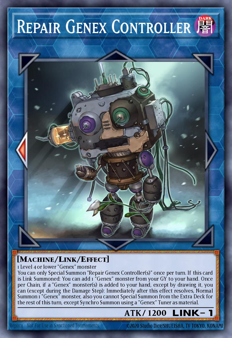 You can only Special Summon “Repair Genex Controller(s)” once per turn. If this card is Link Summoned: You can add 1 “Genex” monster from your GY to your hand. Once per Chain, if a “Genex” monster(s) is added to your hand, except by drawing it, you can (except during the Damage Step): Immediately after this effect resolves, Normal Summon 1 “Genex” monster, also you cannot Special Summon from the Extra Deck for the rest of this turn, except Synchro Summon using a “Genex” Tuner as material.