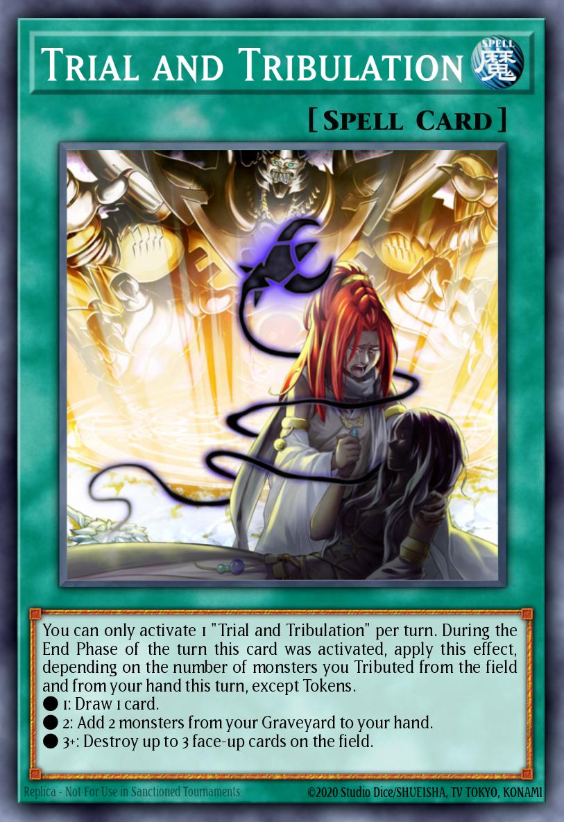 You can only activate 1 “Trial and Tribulation” per turn. During the End Phase of the turn this card was activated, apply this effect, depending on the number of monsters you Tributed from the field and from your hand this turn, except Tokens.